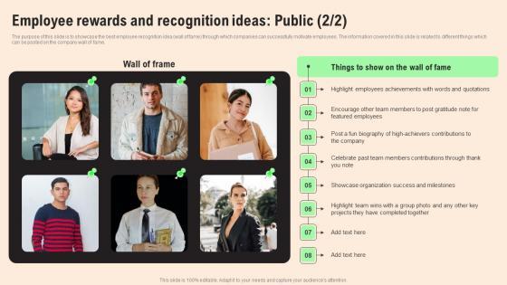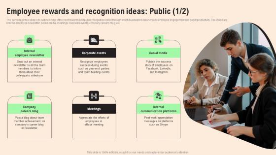 The purpose of this slide is to outline some of the best rewards and public recognition ideas through which businesses can increase employee engagement and boost productivity. The ideas are internal employee newsletter, social media, meetings, corporate events, company careers blog, etc. Are you searching for a Employee Rewards Recognition Public HR Retention Techniques For Business Owners Inspiration Pdf that is uncluttered, straightforward, and original Its easy to edit, and you can change the colors to suit your personal or business branding. For a presentation that expresses how much effort you have put in, this template is ideal With all of its features, including tables, diagrams, statistics, and lists, its perfect for a business plan presentation. Make your ideas more appealing with these professional slides. Download Employee Rewards Recognition Public HR Retention Techniques For Business Owners Inspiration Pdf from Slidegeeks today. The purpose of this slide is to outline some of the best rewards and public recognition ideas through which businesses can increase employee engagement and boost productivity. The ideas are internal employee newsletter, social media, meetings, corporate events, company careers blog, etc.