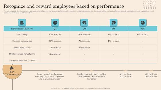 The following slide depicts the employee reward scheme based on their quarterly performance to boost their morale and retention rate. It includes metrics such as outstanding, exceeds expectations,meets expectations, meets minimum expectations, unable to meet etc. This Recognize And Reward Employees Based On Performance Topics PDF is perfect for any presentation, be it in front of clients or colleagues. It is a versatile and stylish solution for organizing your meetings. The product features a modern design for your presentation meetings. The adjustable and customizable slides provide unlimited possibilities for acing up your presentation. Slidegeeks has done all the homework before launching the product for you. So, do not wait, grab the presentation templates today
