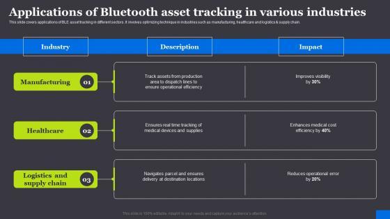 This slide covers applications of BLE asset tracking in different sectors. It involves optimizing technique in industries such as manufacturing, healthcare and logistics and supply chain. Create an editable Applications Of Bluetooth Asset Tracking RFID Solutions For Asset Traceability Themes Pdf that communicates your idea and engages your audience. Whether you are presenting a business or an educational presentation, pre designed presentation templates help save time. Applications Of Bluetooth Asset Tracking RFID Solutions For Asset Traceability Themes Pdf is highly customizable and very easy to edit, covering many different styles from creative to business presentations. Slidegeeks has creative team members who have crafted amazing templates. So, go and get them without any delay. This slide covers applications of BLE asset tracking in different sectors. It involves optimizing technique in industries such as manufacturing, healthcare and logistics and supply chain.