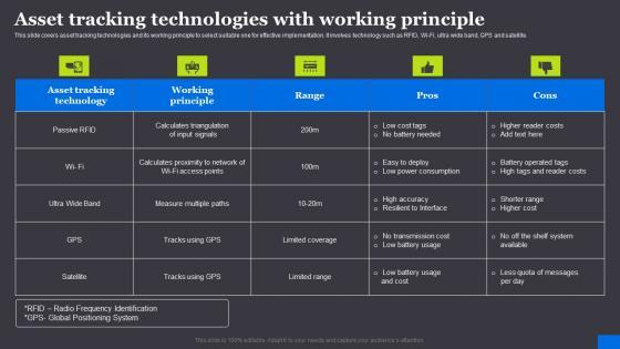 This slide covers asset tracking technologies and its working principle to select suitable one for effective implementation. It involves technology such as RFID, Wi Fi, ultra wide band, GPS and satellite. Want to ace your presentation in front of a live audience Our Asset Tracking Technologies With Working RFID Solutions For Asset Traceability Demonstration Pdf can help you do that by engaging all the users towards you. Slidegeeks experts have put their efforts and expertise into creating these impeccable powerpoint presentations so that you can communicate your ideas clearly. Moreover, all the templates are customizable, and easy to edit and downloadable. Use these for both personal and commercial use. This slide covers asset tracking technologies and its working principle to select suitable one for effective implementation. It involves technology such as RFID, Wi Fi, ultra wide band, GPS and satellite.
