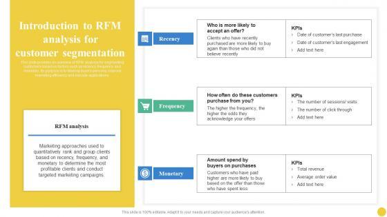 This slide provides an overview of RFM analysis for segmenting customers based on factors such as recency, frequency and monetary. Its purpose is to develop buyers persona, improve marketing efficiency and execute applications. The best PPT templates are a great way to save time, energy, and resources. Slidegeeks have 100 percent editable powerpoint slides making them incredibly versatile. With these quality presentation templates, you can create a captivating and memorable presentation by combining visually appealing slides and effectively communicating your message. Download Introduction To RFM Analysis For Customer Segmentation Guide For Segmenting And Formulating Ideas Pdf from Slidegeeks and deliver a wonderful presentation. This slide provides an overview of RFM analysis for segmenting customers based on factors such as recency, frequency and monetary. Its purpose is to develop buyers persona, improve marketing efficiency and execute applications.
