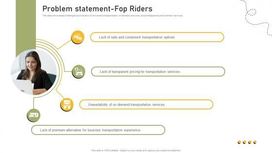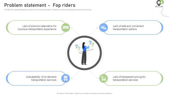 This slide showcases challenges such as lack of convenient transportation, on demand services, price transparency and premium services. Whether you have daily or monthly meetings, a brilliant presentation is necessary. Problem Statement Fop Riders Rideshare Platform Business Model BMC SS V can be your best option for delivering a presentation. Represent everything in detail using Problem Statement Fop Riders Rideshare Platform Business Model BMC SS V and make yourself stand out in meetings. The template is versatile and follows a structure that will cater to your requirements. All the templates prepared by Slidegeeks are easy to download and edit. Our research experts have taken care of the corporate themes as well. So, give it a try and see the results. This slide showcases challenges such as lack of convenient transportation, on demand services, price transparency and premium services.