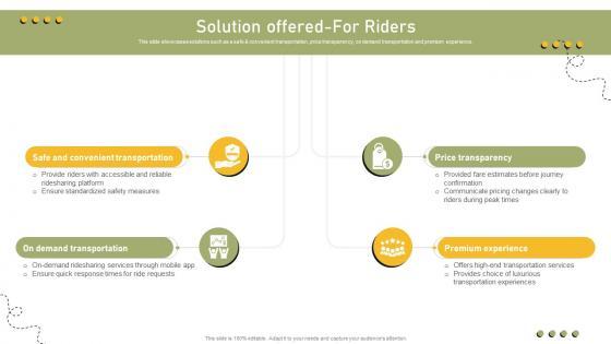 This slide showcases solutions such as a safe and convenient transportation, price transparency, on demand transportation and premium experience. Are you in need of a template that can accommodate all of your creative concepts This one is crafted professionally and can be altered to fit any style. Use it with Google Slides or PowerPoint. Include striking photographs, symbols, depictions, and other visuals. Fill, move around, or remove text boxes as desired. Test out color palettes and font mixtures. Edit and save your work, or work with colleagues. Download Solution Offered For Riders Rideshare Platform Business Model BMC SS V and observe how to make your presentation outstanding. Give an impeccable presentation to your group and make your presentation unforgettable. This slide showcases solutions such as a safe and convenient transportation, price transparency, on demand transportation and premium experience.
