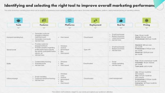 This slide shows four marketing tools which can be used by companies to boost marketing activities performance. It includes various features, platform, deployment and pricing of marketing software. Slidegeeks is here to make your presentations a breeze with Identifying And Selecting Right Developing An Impactful SEO Marketing Plan Information Pdf With our easy to use and customizable templates, you can focus on delivering your ideas rather than worrying about formatting. With a variety of designs to choose from, you are sure to find one that suits your needs. And with animations and unique photos, illustrations, and fonts, you can make your presentation pop. So whether you are giving a sales pitch or presenting to the board, make sure to check out Slidegeeks first This slide shows four marketing tools which can be used by companies to boost marketing activities performance. It includes various features, platform, deployment and pricing of marketing software.