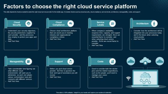 This slide depicts the factors needed to select the right cloud service provider for the mobile app. It includes factors such as cloud security, cloud compliance, service levels, architecture, manageability, costs, and support. Find highly impressive Factors To Choose The Right Cloud Service Platform Application Areas Of Mobile Cloud Computing on Slidegeeks to deliver a meaningful presentation. You can save an ample amount of time using these presentation templates. No need to worry to prepare everything from scratch because Slidegeeks experts have already done a huge research and work for you. You need to download Factors To Choose The Right Cloud Service Platform Application Areas Of Mobile Cloud Computing for your upcoming presentation. All the presentation templates are 100 percent editable and you can change the color and personalize the content accordingly. Download now This slide depicts the factors needed to select the right cloud service provider for the mobile app. It includes factors such as cloud security, cloud compliance, service levels, architecture, manageability, costs, and support