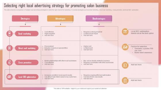 This slide presents a comparison of multiple local advertising strategies to select the right channel for marketing. It includes strategies such as email marketing, direct mail marketing, cross-promotion, and local SEO opimization. Formulating a presentation can take up a lot of effort and time, so the content and message should always be the primary focus. The visuals of the PowerPoint can enhance the presenters message, so our Customizing The Salon Experience Selecting Right Local Advertising Strategy For Promoting Strategy SS V was created to help save time. Instead of worrying about the design, the presenter can concentrate on the message while our designers work on creating the ideal templates for whatever situation is needed. Slidegeeks has experts for everything from amazing designs to valuable content, we have put everything into Customizing The Salon Experience Selecting Right Local Advertising Strategy For Promoting Strategy SS V. This slide presents a comparison of multiple local advertising strategies to select the right channel for marketing. It includes strategies such as email marketing, direct mail marketing, cross-promotion, and local SEO opimization.