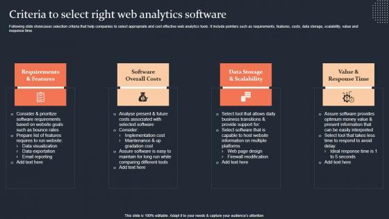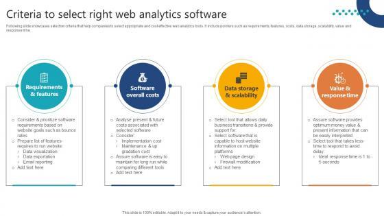 Following slide showcases selection criteria that help companies to select appropriate and cost effective web analytics tools. It include pointers such as requirements, features, costs, data storage, scalability, value and response time. If your project calls for a presentation, then Slidegeeks is your go-to partner because we have professionally designed, easy-to-edit templates that are perfect for any presentation. After downloading, you can easily edit Complete Guide To Launch Criteria To Select Right Web Analytics Software and make the changes accordingly. You can rearrange slides or fill them with different images. Check out all the handy templates Following slide showcases selection criteria that help companies to select appropriate and cost effective web analytics tools. It include pointers such as requirements, features, costs, data storage, scalability, value and response time.