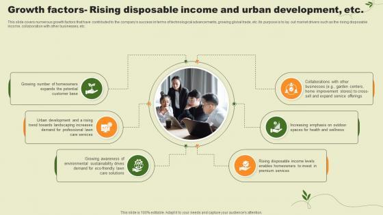 This slide covers numerous growth factors that have contributed to the companys success in terms of technological advancements, growing global trade, etc. Its purpose is to lay out market drivers such as the rising disposable income, collaboration with other businesses, etc. Are you in need of a template that can accommodate all of your creative concepts This one is crafted professionally and can be altered to fit any style. Use it with Google Slides or PowerPoint. Include striking photographs, symbols, depictions, and other visuals. Fill, move around, or remove text boxes as desired. Test out color palettes and font mixtures. Edit and save your work, or work with colleagues. Download Growth Factors Rising Disposable Income And Urban Landscaping Business Plan Ppt Template BP SS V and observe how to make your presentation outstanding. Give an impeccable presentation to your group and make your presentation unforgettable. This slide covers numerous growth factors that have contributed to the companys success in terms of technological advancements, growing global trade, etc. Its purpose is to lay out market drivers such as the rising disposable income, collaboration with other businesses, etc.