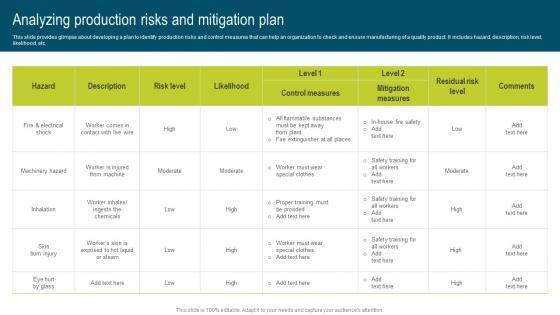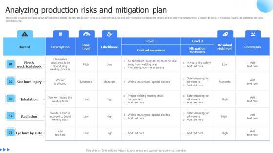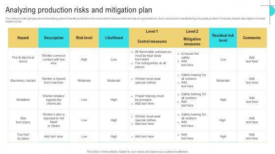 This slide provides glimpse about developing a plan to identify production risks and control measures that can help an organization to check and ensure manufacturing of a quality product. It includes hazard, description, risk level, likelihood, etc. Are you in need of a template that can accommodate all of your creative concepts This one is crafted professionally and can be altered to fit any style. Use it with Google Slides or PowerPoint. Include striking photographs, symbols, depictions, and other visuals. Fill, move around, or remove text boxes as desired. Test out color palettes and font mixtures. Edit and save your work, or work with colleagues. Download Manufacturing Quality Assurance And Control Measures Analyzing Production Risks Mitigation Elements PDF and observe how to make your presentation outstanding. Give an impeccable presentation to your group and make your presentation unforgettable.