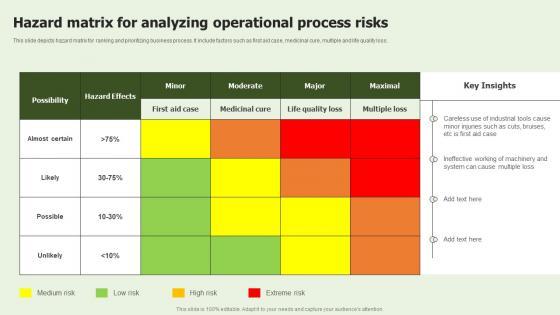 This slide depicts hazard matrix for ranking and prioritizing business process. It include factors such as first aid case, medicinal cure, multiple and life quality loss. Showcasing this set of slides titled Hazard Matrix For Analyzing Operational Process Risks Brochure Pdf. The topics addressed in these templates are Hazard Matrix For Analyzing, Operational Process Risks. All the content presented in this PPT design is completely editable. Download it and make adjustments in color, background, font etc. as per your unique business setting. This slide depicts hazard matrix for ranking and prioritizing business process. It include factors such as first aid case, medicinal cure, multiple and life quality loss.