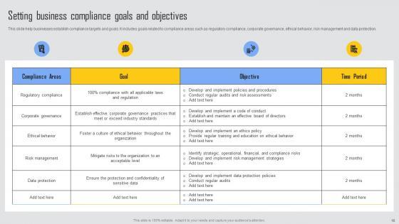 This slide help businesses establish compliance targets and goals. It includes goals related to compliance areas such as regulatory compliance, corporate governance, ethical behavior, risk management and data protection. Boost your pitch with our creative Setting Business Compliance Managing Risks And Establishing Trust Through Efficient Structure Pdf. Deliver an awe inspiring pitch that will mesmerize everyone. Using these presentation templates you will surely catch everyones attention. You can browse the ppts collection on our website. We have researchers who are experts at creating the right content for the templates. So you do not have to invest time in any additional work. Just grab the template now and use them. This slide help businesses establish compliance targets and goals. It includes goals related to compliance areas such as regulatory compliance, corporate governance, ethical behavior, risk management and data protection.