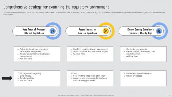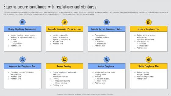 This slide presents steps to ensure regulatory compliance and develop a successful compliance program. It includes steps such as identify regulatory requirements, designate responsible person or team, evaluate current compliance status, create a compliance plan, implement compliance plan, provide training, monitor compliance and update compliance plan. There are so many reasons you need a Steps To Ensure Compliance Managing Risks And Establishing Trust Through Efficient Microsoft Pdf, The first reason is you can not spend time making everything from scratch, Thus, Slidegeeks has made presentation templates for you too. You can easily download these templates from our website easily. This slide presents steps to ensure regulatory compliance and develop a successful compliance program. It includes steps such as identify regulatory requirements, designate responsible person or team, evaluate current compliance status, create a compliance plan, implement compliance plan, provide training, monitor compliance and update compliance plan.