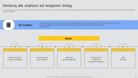 This slide provides an overview of data compliance and its importance in business. It includes benefits such as easier business process automation, increased trust and credibility, improved data management, protected and enhanced enterprise reputation. Make sure to capture your audiences attention in your business displays with our gratis customizable Introducing Data Compliance Managing Risks And Establishing Trust Through Efficient Rules Pdf. These are great for business strategies, office conferences, capital raising or task suggestions. If you desire to acquire more customers for your tech business and ensure they stay satisfied, create your own sales presentation with these plain slides. This slide provides an overview of data compliance and its importance in business. It includes benefits such as easier business process automation, increased trust and credibility, improved data management, protected and enhanced enterprise reputation.