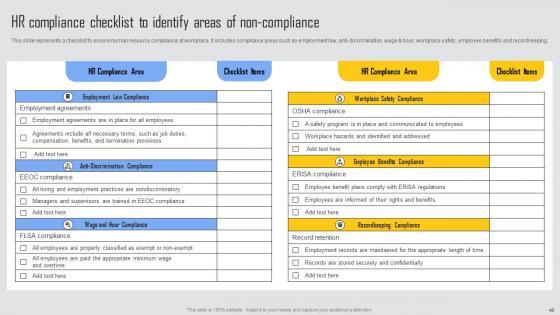 This slide presents an overview of HR compliance management. It also include strategies to ensure compliance such as, maintain track of business compliance requirements, organize HR departments compliance obligations, keep up with legislative changes, conduct routine HR policy audits, utilize HR technology and crate HR compliance checklist. Find highly impressive HR Compliance Management Managing Risks And Establishing Trust Through Efficient Template Pdf on Slidegeeks to deliver a meaningful presentation. You can save an ample amount of time using these presentation templates. No need to worry to prepare everything from scratch because Slidegeeks experts have already done a huge research and work for you. You need to download HR Compliance Management Managing Risks And Establishing Trust Through Efficient Template Pdf for your upcoming presentation. All the presentation templates are 100 percent editable and you can change the color and personalize the content accordingly. Download now This slide presents an overview of HR compliance management. It also include strategies to ensure compliance such as, maintain track of business compliance requirements, organize HR departments compliance obligations, keep up with legislative changes, conduct routine HR policy audits, utilize HR technology and crate HR compliance checklist.
