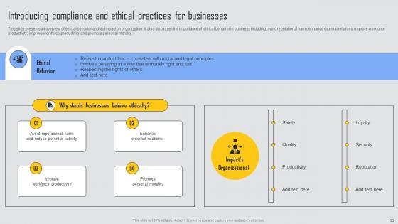 This slide presents an overview of ethical behavior and its impact on organization. It also discusses the importance of ethical behavior in business including, avoid reputational harm, enhance external relations, improve workforce productivity, improve workforce productivity and promote personal morality. Crafting an eye catching presentation has never been more straightforward. Let your presentation shine with this tasteful yet straightforward Introducing Compliance Ethical Managing Risks And Establishing Trust Through Efficient Microsoft Pdf template. It offers a minimalistic and classy look that is great for making a statement. The colors have been employed intelligently to add a bit of playfulness while still remaining professional. Construct the ideal Introducing Compliance Ethical Managing Risks And Establishing Trust Through Efficient Microsoft Pdf that effortlessly grabs the attention of your audience Begin now and be certain to wow your customers This slide presents an overview of ethical behavior and its impact on organization. It also discusses the importance of ethical behavior in business including, avoid reputational harm, enhance external relations, improve workforce productivity, improve workforce productivity and promote personal morality.