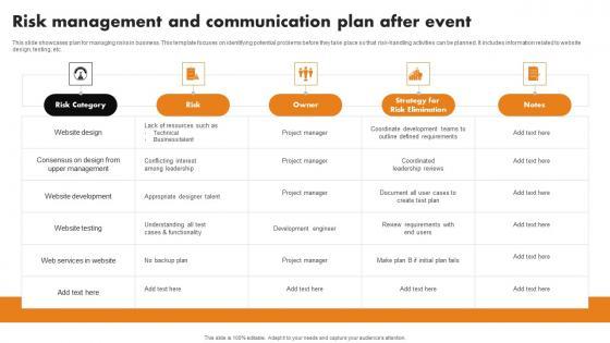 This slide showcases plan for managing risks in business. This template focuses on identifying potential problems before they take place so that risk handling activities can be planned. It includes information related to website design, testing, etc.Showcasing this set of slides titled Risk Management And Communication Plan After Event Portrait Pdf The topics addressed in these templates are Website Development, Website Testing, Appropriate Designer All the content presented in this PPT design is completely editable. Download it and make adjustments in color, background, font etc. as per your unique business setting. This slide showcases plan for managing risks in business. This template focuses on identifying potential problems before they take place so that risk handling activities can be planned. It includes information related to website design, testing, etc.