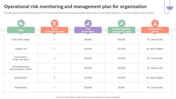 This slide represents the plan to ensure relevance of risk management treatment as well as progresses made in treatment plan. It includes details related to risk, no.of annual incidents, cost per incident etc. Retrieve professionally designed Operational Risk Assessment And Management Plan Operational Risk Monitoring And Management Plan Themes PDF to effectively convey your message and captivate your listeners. Save time by selecting pre-made slideshows that are appropriate for various topics, from business to educational purposes. These themes come in many different styles, from creative to corporate, and all of them are easily adjustable and can be edited quickly. Access them as PowerPoint templates or as Google Slides themes. You dont have to go on a hunt for the perfect presentation because Slidegeeks got you covered from everywhere.