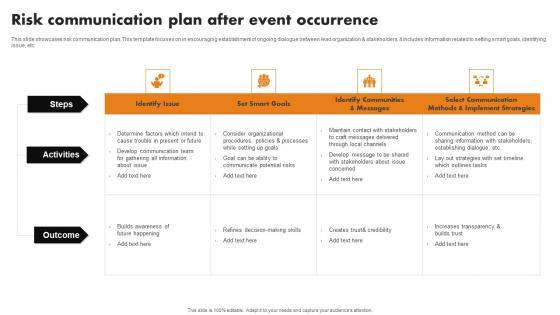 This slide showcases risk communication plan. This template focuses on in encouraging establishment of ongoing dialogue between lead organization and stakeholders. It includes information related to setting smart goals, identifying issue, etc.Showcasing this set of slides titled Risk Communication Plan After Event Occurrence Professional Pdf The topics addressed in these templates are Develop Communication, Communicate Potential Risks, Communication Method All the content presented in this PPT design is completely editable. Download it and make adjustments in color, background, font etc. as per your unique business setting. This slide showcases risk communication plan. This template focuses on in encouraging establishment of ongoing dialogue between lead organization and stakeholders. It includes information related to setting smart goals, identifying issue, etc.