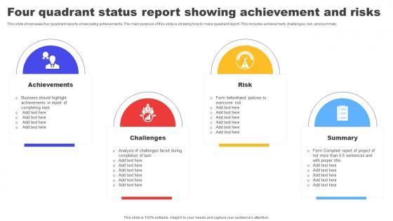 This slide showcases four quadrant reports showcasing achievements. The main purpose of this slide is showing how to make quadrant report. This includes achievement, challenges, risk, and summary. Pitch your topic with ease and precision using this Four Quadrant Status Report Showing Achievement And Risks Download pdf. This layout presents information on Achievement, Challenges, Risk, Summary. It is also available for immediate download and adjustment. So, changes can be made in the color, design, graphics or any other component to create a unique layout. This slide showcases four quadrant reports showcasing achievements. The main purpose of this slide is showing how to make quadrant report. This includes achievement, challenges, risk, and summary.