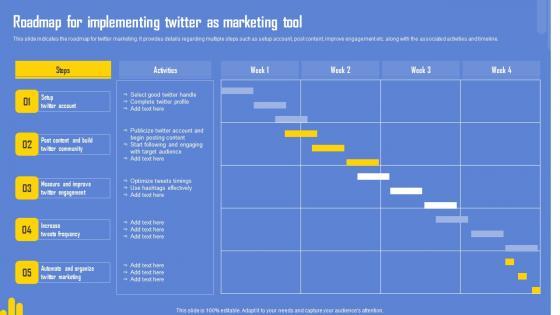 This slide indicates the roadmap for twitter marketing. It provides details regarding multiple steps such as setup account, post content, improve engagement etc. along with the associated activities and timeline. From laying roadmaps to briefing everything in detail, our templates are perfect for you. You can set the stage with your presentation slides. All you have to do is download these easy-to-edit and customizable templates. Utilizing Twitter For Social Media Roadmap For Implementing Twitter As Marketing Tool Guidelines PDF will help you deliver an outstanding performance that everyone would remember and praise you for. Do download this presentation today.
