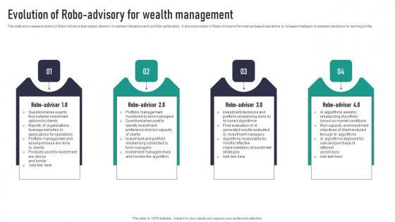 This slide showcases evolution of Robo-Advisors that helped clients in investment decisions and portfolio optimization. It shows evolution of Robo-Advisors from manual based operations to AI-based intelligent investment decisions for earning profits. Are you searching for a Ways Artificial Intelligence Is Transforming Finance Sector Evolution Of Robo Advisory For Wealth Ideas PDF that is uncluttered, straightforward, and original Its easy to edit, and you can change the colors to suit your personal or business branding. For a presentation that expresses how much effort you have put in, this template is ideal. With all of its features, including tables, diagrams, statistics, and lists, its perfect for a business plan presentation. Make your ideas more appealing with these professional slides. Download Ways Artificial Intelligence Is Transforming Finance Sector Evolution Of Robo Advisory For Wealth Ideas PDF from Slidegeeks today.