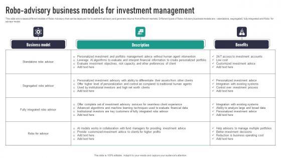 This slide showcases different models of Robo-Advisory that can be deployed for investment advisory and generate returns from different markets. Different types of Robo-Advisory business models are standalone, segregated, fully integrated and Robo for advisor model. This Robo Advisory Business Models For Investment Management Sample Pdf from Slidegeeks makes it easy to present information on your topic with precision. It provides customization options, so you can make changes to the colors, design, graphics, or any other component to create a unique layout. It is also available for immediate download, so you can begin using it right away. Slidegeeks has done good research to ensure that you have everything you need to make your presentation stand out. Make a name out there for a brilliant performance. This slide showcases different models of Robo-Advisory that can be deployed for investment advisory and generate returns from different markets. Different types of Robo-Advisory business models are standalone, segregated, fully integrated and Robo for advisor model.