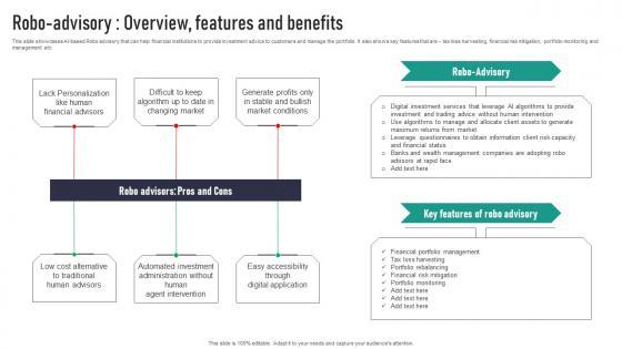 This slide showcases AI-based Robo advisory that can help financial institutions to provide investment advice to customers and manage the portfolio. It also shows key features that are tax loss harvesting, financial risk mitigation, portfolio monitoring and management etc.Slidegeeks is here to make your presentations a breeze with Robo Advisory Overview Features And Benefits Artificial Intelligence Applications Information Pdf With our easy-to-use and customizable templates, you can focus on delivering your ideas rather than worrying about formatting. With a variety of designs to choose from, you are sure to find one that suits your needs. And with animations and unique photos, illustrations, and fonts, you can make your presentation pop. So whether you are giving a sales pitch or presenting to the board, make sure to check out Slidegeeks first. This slide showcases AI based Robo advisory that can help financial institutions to provide investment advice to customers and manage the portfolio. It also shows key features that are tax loss harvesting, financial risk mitigation, portfolio monitoring and management etc.