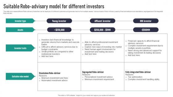 This slide showcases different Robo-advisory model that can be deployed for different customers and generate returns from multiple assets. Various model of Robo-Advisory used by financial institutions are standalone, segregated and full integrated Robo-advisor.If your project calls for a presentation, then Slidegeeks is your go-to partner because we have professionally designed, easy-to-edit templates that are perfect for any presentation. After downloading, you can easily edit Suitable Robo Advisory Model For Different Artificial Intelligence Applications Elements Pdf and make the changes accordingly. You can rearrange slides or fill them with different images. Check out all the handy templates This slide showcases different Robo advisory model that can be deployed for different customers and generate returns from multiple assets. Various model of Robo Advisory used by financial institutions are standalone, segregated and full integrated Robo advisor.