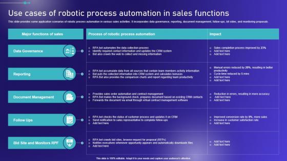 This slide provides some application scenarios of robotic process automation in various sales activities. It incorporates data governance, reporting, document management, follow-ups, bit sides, and monitoring proposals. Are you in need of a template that can accommodate all of your creative concepts This one is crafted professionally and can be altered to fit any style. Use it with Google Slides or PowerPoint. Include striking photographs, symbols, depictions, and other visuals. Fill, move around, or remove text boxes as desired. Test out color palettes and font mixtures. Edit and save your work, or work with colleagues. Download Use Cases Of Robotic Process Automation In Sales Functions Portrait PDF and observe how to make your presentation outstanding. Give an impeccable presentation to your group and make your presentation unforgettable.