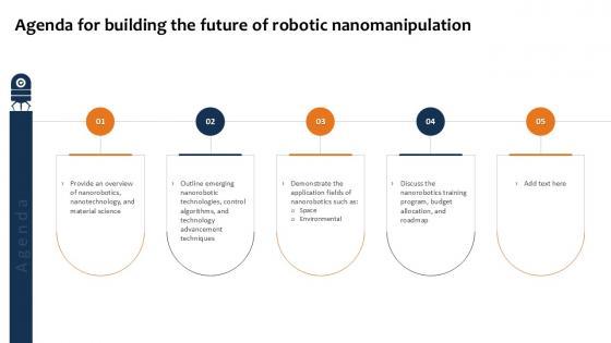 Slidegeeks is one of the best resources for PowerPoint templates. You can download easily and regulate Agenda For Building The Future Of Robotic Nanomanipulation Ppt Presentation for your personal presentations from our wonderful collection. A few clicks is all it takes to discover and get the most relevant and appropriate templates. Use our Templates to add a unique zing and appeal to your presentation and meetings. All the slides are easy to edit and you can use them even for advertisement purposes. Our Agenda For Building The Future Of Robotic Nanomanipulation Ppt Presentation are topically designed to provide an attractive backdrop to any subject. Use them to look like a presentation pro.