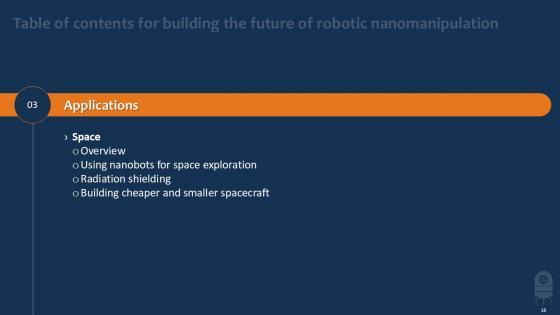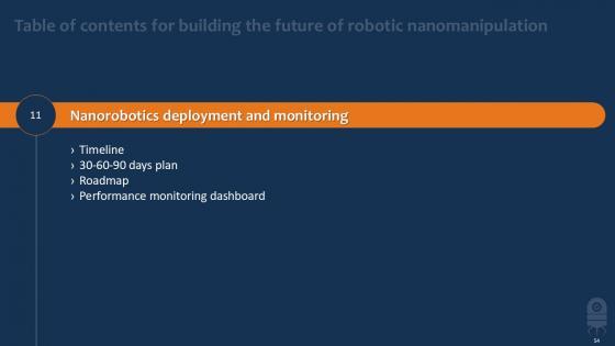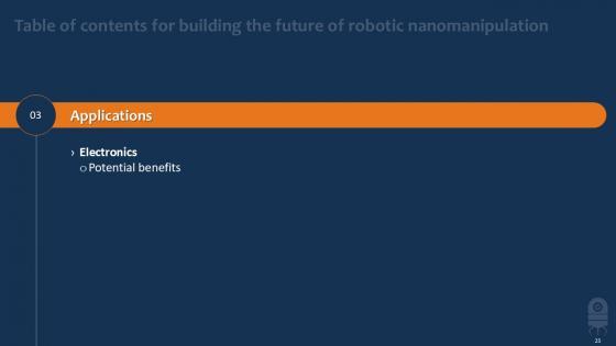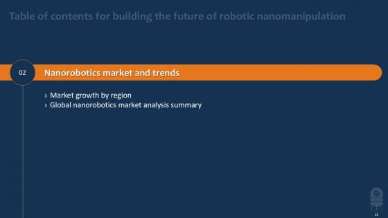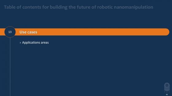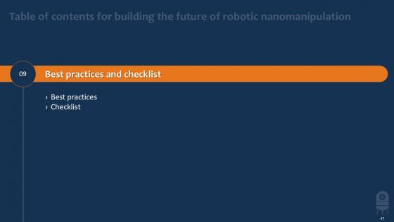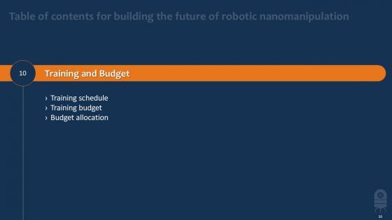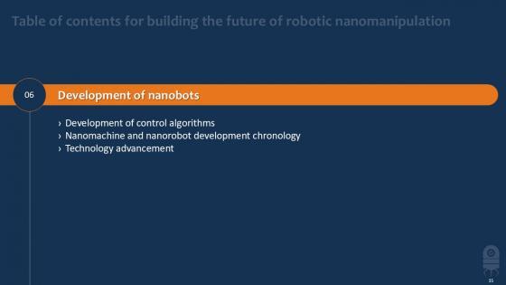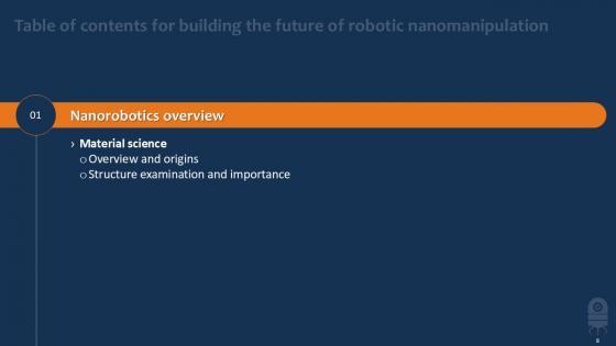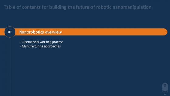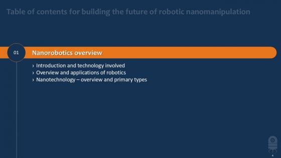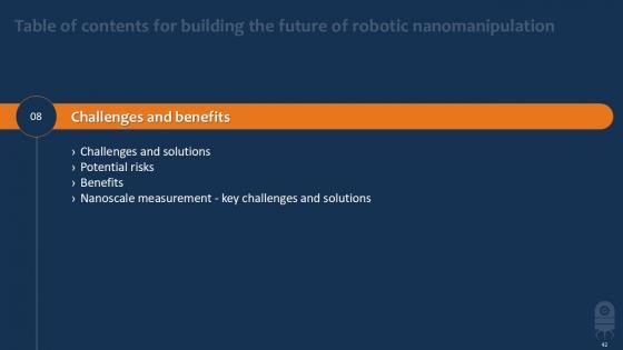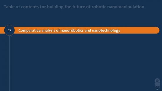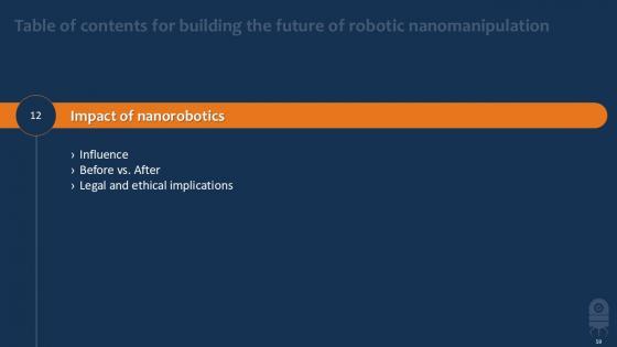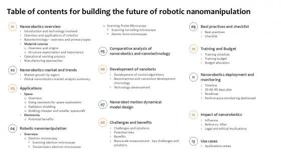 Want to ace your presentation in front of a live audience Our Table Of Contents Building The Future Of Robotic Nanomanipulation Ppt Example can help you do that by engaging all the users towards you. Slidegeeks experts have put their efforts and expertise into creating these impeccable powerpoint presentations so that you can communicate your ideas clearly. Moreover, all the templates are customizable, and easy-to-edit and downloadable. Use these for both personal and commercial use. Our Table Of Contents Building The Future Of Robotic Nanomanipulation Ppt Example are topically designed to provide an attractive backdrop to any subject. Use them to look like a presentation pro.