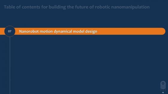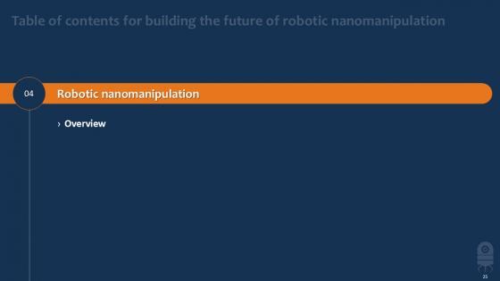 Use this Building the Future of Robotic Nanomanipulation PPT Presentation to ensure the business world gets to know you as a presentation expert with tremendous recall value. With its focus on providing the worlds best designs to highlight business ideas that have the potential to change the world, this PPT Template is sure to win you clients. The complete deck in seventy six slides is a compendium of information, structured in a manner that provides the best framework for a presentation. Use this completely editable and customizable presentation to make an impact and improve your order book. Download now. Our Building the Future of Robotic Nanomanipulation PPT Presentation are topically designed to provide an attractive backdrop to any subject. Use them to look like a presentation pro.
