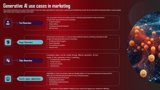 This slide showcases use cases of Generative AI that can help organization to improve the marketing and advertising results. Its key elements are text generation, search engine optimization plus image and video generation. Take your projects to the next level with our ultimate collection of Generative AI Use Cases In Marketing Role Of Generative AI Tools Across Icons Pdf. Slidegeeks has designed a range of layouts that are perfect for representing task or activity duration, keeping track of all your deadlines at a glance. Tailor these designs to your exact needs and give them a truly corporate look with your own brand colors they well make your projects stand out from the rest. This slide showcases use cases of Generative AI that can help organization to improve the marketing and advertising results. Its key elements are text generation, search engine optimization plus image and video generation.
