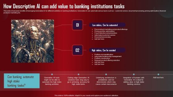 This slide showcases benefits of leveraging Generative AI for different activities in banking institutions. Generative AI can automate various tasks such as customer service, document processing, pricing optimization, financial products marketing etc. Boost your pitch with our creative How Descriptive AI Can Add Value Role Of Generative AI Tools Across Information Pdf. Deliver an awe inspiring pitch that will mesmerize everyone. Using these presentation templates you will surely catch everyones attention. You can browse the ppts collection on our website. We have researchers who are experts at creating the right content for the templates. So you do not have to invest time in any additional work. Just grab the template now and use them. This slide showcases benefits of leveraging Generative AI for different activities in banking institutions. Generative AI can automate various tasks such as customer service, document processing, pricing optimization, financial products marketing etc.