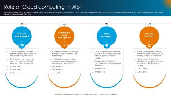 The purpose of this slide is to highlight importance of cloud computing in Artificial Internet of Things AIoT. Resource management, data processing, centralized data management, and AI model training are some of the major advantages which are outlined in slide. Whether you have daily or monthly meetings, a brilliant presentation is necessary. Role Of Cloud Computing In AIOT Applications For Various Industries IoT SS V can be your best option for delivering a presentation. Represent everything in detail using Role Of Cloud Computing In AIOT Applications For Various Industries IoT SS V and make yourself stand out in meetings. The template is versatile and follows a structure that will cater to your requirements. All the templates prepared by Slidegeeks are easy to download and edit. Our research experts have taken care of the corporate themes as well. So, give it a try and see the results. The purpose of this slide is to highlight importance of cloud computing in Artificial Internet of Things AIoT. Resource management, data processing, centralized data management, and AI model training are some of the major advantages which are outlined in slide.
