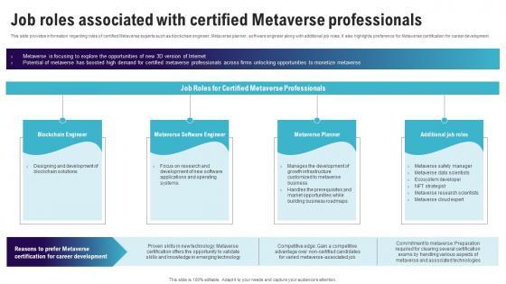 This slide provides information regarding roles of certified Metaverse experts such as blockchain engineer, Metaverse planner, software engineer along with additional job roles. It also highlights preference for Metaverse certification for career development. Boost your pitch with our creative Job Roles Associated With Certified Continuum Of Technology Revamping Business AI SS V. Deliver an awe-inspiring pitch that will mesmerize everyone. Using these presentation templates you will surely catch everyones attention. You can browse the ppts collection on our website. We have researchers who are experts at creating the right content for the templates. So you do not have to invest time in any additional work. Just grab the template now and use them. This slide provides information regarding roles of certified Metaverse experts such as blockchain engineer, Metaverse planner, software engineer along with additional job roles. It also highlights preference for Metaverse certification for career development.