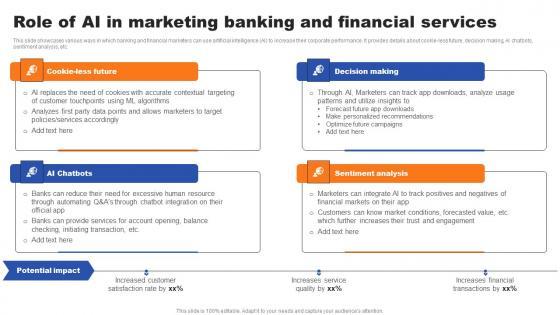 This slide showcases various ways in which banking and financial marketers can use artificial intelligence AI to increase their corporate performance. It provides details about cookie-less future, decision making, AI chatbots, sentiment analysis, etc. From laying roadmaps to briefing everything in detail, our templates are perfect for you. You can set the stage with your presentation slides. All you have to do is download these easy-to-edit and customizable templates. Role Of AI In Marketing Banking And Financial Services Ppt Infographic Template Ideas PDF will help you deliver an outstanding performance that everyone would remember and praise you for. Do download this presentation today. This slide showcases various ways in which banking and financial marketers can use artificial intelligence AI to increase their corporate performance. It provides details about cookie-less future, decision making, AI chatbots, sentiment analysis, etc.
