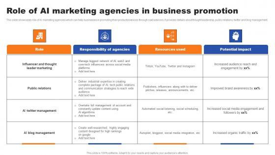This slide showcases role of AI marketing agencies which can help businesses in promoting their products or services through said advisors. It provides details about thought leadership, public relations, twitter and blog management. Present like a pro with Role Of AI Marketing Agencies In Business Promotion Ppt Model Summary PDF Create beautiful presentations together with your team, using our easy-to-use presentation slides. Share your ideas in real-time and make changes on the fly by downloading our templates. So whether you are in the office, on the go, or in a remote location, you can stay in sync with your team and present your ideas with confidence. With Slidegeeks presentation got a whole lot easier. Grab these presentations today. This slide showcases role of AI marketing agencies which can help businesses in promoting their products or services through said advisors. It provides details about thought leadership, public relations, twitter and blog management.