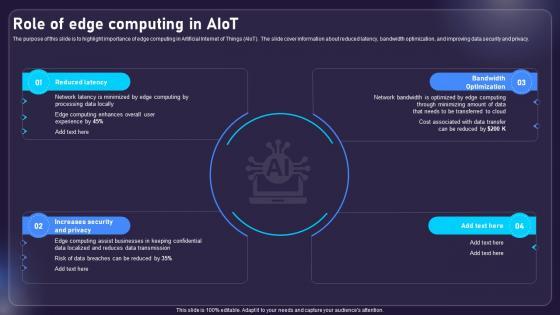 The purpose of this slide is to highlight importance of edge computing in Artificial Internet of Things AIoT. The slide cover information about reduced latency, bandwidth optimization, and improving data security and privacy. Do you have an important presentation coming up Are you looking for something that will make your presentation stand out from the rest Look no further than Integrating AI With IoT Role Of Edge Computing In AIoT IoT SS V. With our professional designs, you can trust that your presentation will pop and make delivering it a smooth process. And with Slidegeeks, you can trust that your presentation will be unique and memorable. So why wait Grab Integrating AI With IoT Role Of Edge Computing In AIoT IoT SS V today and make your presentation stand out from the rest The purpose of this slide is to highlight importance of edge computing in Artificial Internet of Things AIoT. The slide cover information about reduced latency, bandwidth optimization, and improving data security and privacy.