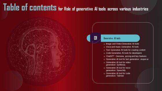 Slidegeeks is here to make your presentations a breeze with Table Of Contents For Role Of Generative AI Tools Across Various Industries Infographics Pdf With our easy to use and customizable templates, you can focus on delivering your ideas rather than worrying about formatting. With a variety of designs to choose from, you are sure to find one that suits your needs. And with animations and unique photos, illustrations, and fonts, you can make your presentation pop. So whether you are giving a sales pitch or presenting to the board, make sure to check out Slidegeeks first. Our Table Of Contents For Role Of Generative AI Tools Across Various Industries Infographics Pdf are topically designed to provide an attractive backdrop to any subject. Use them to look like a presentation pro.