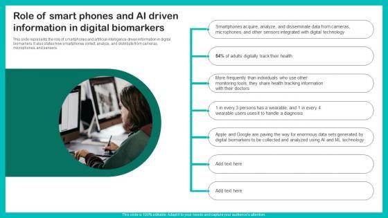 This slide represents the role of smartphones and artificial intelligence driven information in digital biomarkers. It also states how smartphones collect, analyze, and distribute from cameras, microphones, and sensors. From laying roadmaps to briefing everything in detail, our templates are perfect for you. You can set the stage with your presentation slides. All you have to do is download these easy to edit and customizable templates. Role Of Smart Phones Ai Driven Biomedical Data Science And Health Informatics Introduction Pdf will help you deliver an outstanding performance that everyone would remember and praise you for. Do download this presentation today. This slide represents the role of smartphones and artificial intelligence driven information in digital biomarkers. It also states how smartphones collect, analyze, and distribute from cameras, microphones, and sensors.
