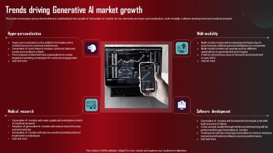 This slide showcases various trends that are contributing to the growth of Generative AI market. Its key elements are hyper personalization, multi modality, software development and medical research. Whether you have daily or monthly meetings, a brilliant presentation is necessary. Trends Driving Generative AI Role Of Generative AI Tools Across Infographics Pdf can be your best option for delivering a presentation. Represent everything in detail using Trends Driving Generative AI Role Of Generative AI Tools Across Infographics Pdf and make yourself stand out in meetings. The template is versatile and follows a structure that will cater to your requirements. All the templates prepared by Slidegeeks are easy to download and edit. Our research experts have taken care of the corporate themes as well. So, give it a try and see the results. This slide showcases various trends that are contributing to the growth of Generative AI market. Its key elements are hyper-personalization, multi modality, software development and medical research.