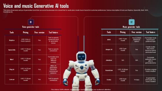 This slide showcases various AI generative tools that can assist businesses in to convert text to audio plus create music based on customer preferences. Various descriptive AI tools are Replica, Speechify, Murf, AIVA, Soundraw etc. Find highly impressive Voice And Music Generative AI Tools Role Of Generative AI Tools Across Guidelines Pdf on Slidegeeks to deliver a meaningful presentation. You can save an ample amount of time using these presentation templates. No need to worry to prepare everything from scratch because Slidegeeks experts have already done a huge research and work for you. You need to download Voice And Music Generative AI Tools Role Of Generative AI Tools Across Guidelines Pdf for your upcoming presentation. All the presentation templates are 100 percent editable and you can change the color and personalize the content accordingly. Download now. This slide showcases various AI generative tools that can assist businesses in to convert text to audio plus create music based on customer preferences. Various descriptive AI tools are Replica, Speechify, Murf, AIVA, Soundraw etc.