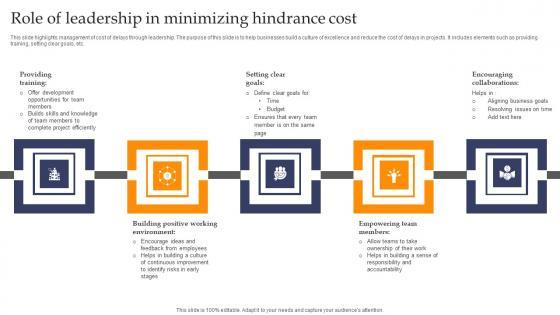 This slide highlights management of cost of delays through leadership. The purpose of this slide is to help businesses build a culture of excellence and reduce the cost of delays in projects. It includes elements such as providing training, setting clear goals, etc. Showcasing this set of slides titled Role Of Leadership In Minimizing Hindrance Cost Brochure pdf. The topics addressed in these templates are Providing Training, Setting Clear Goals, Encouraging Collaborations. All the content presented in this PPT design is completely editable. Download it and make adjustments in color, background, font etc. as per your unique business setting. This slide highlights management of cost of delays through leadership. The purpose of this slide is to help businesses build a culture of excellence and reduce the cost of delays in projects. It includes elements such as providing training, setting clear goals, etc.