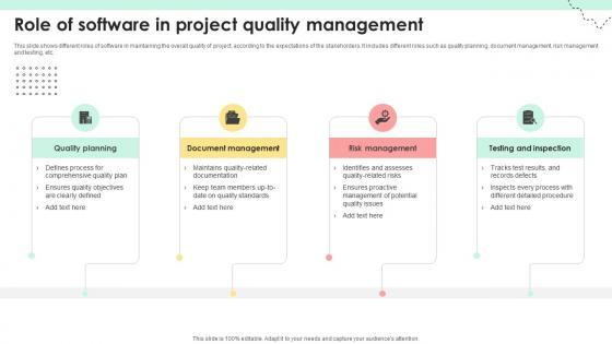 This slide shows different roles of software in maintaining the overall quality of project, according to the expectations of the stakeholders. It includes different roles such as quality planning, document management, risk management and testing, etc. Do you have to make sure that everyone on your team knows about any specific topic I yes, then you should give Administering Quality Assurance Role Of Software In Project Quality Management PM SS V a try. Our experts have put a lot of knowledge and effort into creating this impeccable Administering Quality Assurance Role Of Software In Project Quality Management PM SS V. You can use this template for your upcoming presentations, as the slides are perfect to represent even the tiniest detail. You can download these templates from the Slidegeeks website and these are easy to edit. So grab these today This slide shows different roles of software in maintaining the overall quality of project, according to the expectations of the stakeholders. It includes different roles such as quality planning, document management, risk management and testing, etc.