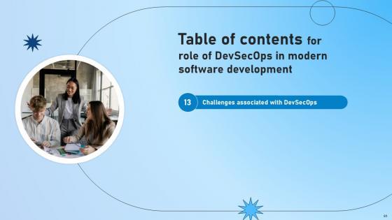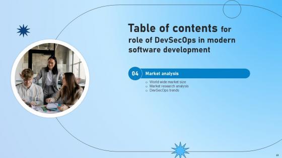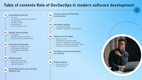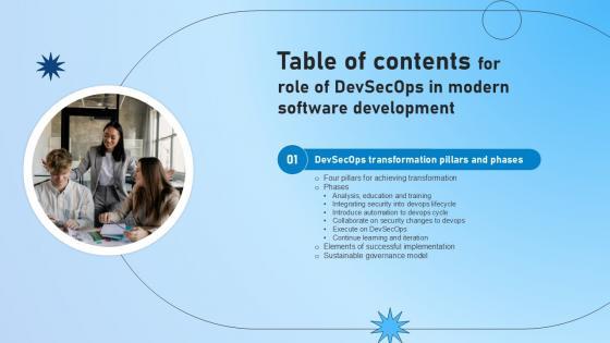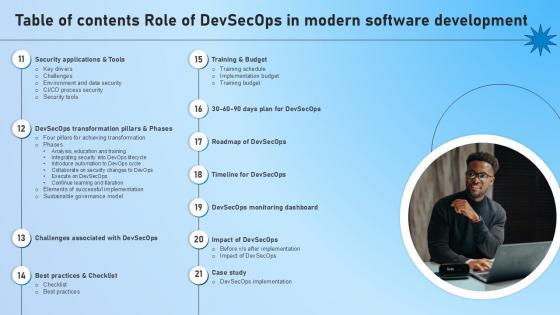 Slidegeeks is here to make your presentations a breeze with Table Of Contents Role Of Devsecops In Modern Software Development Ppt Template With our easy-to-use and customizable templates, you can focus on delivering your ideas rather than worrying about formatting. With a variety of designs to choose from, you are sure to find one that suits your needs. And with animations and unique photos, illustrations, and fonts, you can make your presentation pop. So whether you are giving a sales pitch or presenting to the board, make sure to check out Slidegeeks first Our Table Of Contents Role Of Devsecops In Modern Software Development Ppt Template are topically designed to provide an attractive backdrop to any subject. Use them to look like a presentation pro.