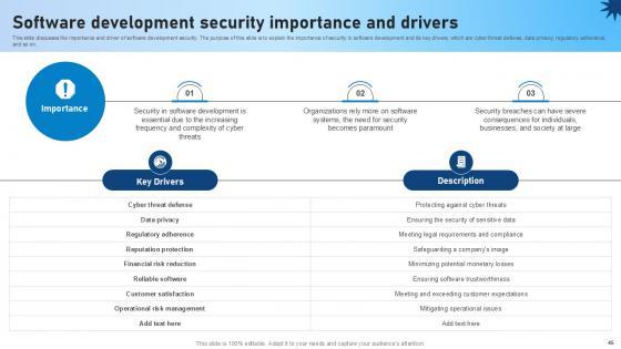 This slide discusses the importance and driver of software development security. The purpose of this slide is to explain the importance of security in software development and its key drivers, which are cyber threat defense, data privacy, regulatory adherence, and so on. Do you have to make sure that everyone on your team knows about any specific topic I yes, then you should give Software Development Security Importance And Drivers Role Of Devsecops Ppt Slide a try. Our experts have put a lot of knowledge and effort into creating this impeccable Software Development Security Importance And Drivers Role Of Devsecops Ppt Slide You can use this template for your upcoming presentations, as the slides are perfect to represent even the tiniest detail. You can download these templates from the Slidegeeks website and these are easy to edit. So grab these today This slide discusses the importance and driver of software development security. The purpose of this slide is to explain the importance of security in software development and its key drivers, which are cyber threat defense, data privacy, regulatory adherence, and so on.