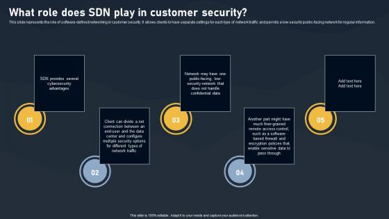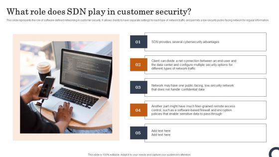 This slide represents the role of software-defined networking in customer security. It allows clients to have separate settings for each type of network traffic and permits a low-security public-facing network for regular information. Do you know about Slidesgeeks What Role Does SDN Play In Customer Security Ppt Infographic Template Slides PDF These are perfect for delivering any kind od presentation. Using it, create PowerPoint presentations that communicate your ideas and engage audiences. Save time and effort by using our pre designed presentation templates that are perfect for a wide range of topic. Our vast selection of designs covers a range of styles, from creative to business, and are all highly customizable and easy to edit. Download as a PowerPoint template or use them as Google Slides themes.