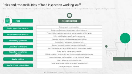 The slide showcases roles and responsibilities of food inspection team during and after food is packed. It contains elements such as to develop control strategies, reviewing labels, scheduling inspections etc. Here you can discover an assortment of the finest PowerPoint and Google Slides templates. With these templates, you can create presentations for a variety of purposes while simultaneously providing your audience with an eye-catching visual experience. Download Roles And Responsibilities Of Food Inspection Working Staff to deliver an impeccable presentation. These templates will make your job of preparing presentations much quicker, yet still, maintain a high level of quality. Slidegeeks has experienced researchers who prepare these templates and write high-quality content for you. Later on, you can personalize the content by editing the Roles And Responsibilities Of Food Inspection Working Staff. The slide showcases roles and responsibilities of food inspection team during and after food is packed. It contains elements such as to develop control strategies, reviewing labels, scheduling inspections etc.