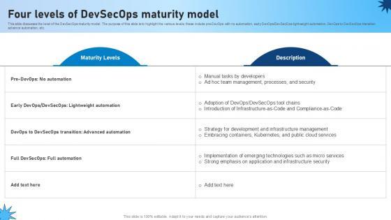 This slide discusses the level of the DevSecOps maturity model. The purpose of this slide is to highlight the various levels these include pre-DevOps with no automation, early DevOpsDevSecOps lightweight automation, DevOps to DevSecOps transition advance automation, etc. Retrieve professionally designed Four Levels Of Devsecops Maturity Model Role Of Devsecops Ppt Template to effectively convey your message and captivate your listeners. Save time by selecting pre-made slideshows that are appropriate for various topics, from business to educational purposes. These themes come in many different styles, from creative to corporate, and all of them are easily adjustable and can be edited quickly. Access them as PowerPoint templates or as Google Slides themes. You do not have to go on a hunt for the perfect presentation because Slidegeeks got you covered from everywhere. This slide discusses the level of the DevSecOps maturity model. The purpose of this slide is to highlight the various levels these include pre-DevOps with no automation, early DevOpsDevSecOps lightweight automation, DevOps to DevSecOps transition advance automation, etc.